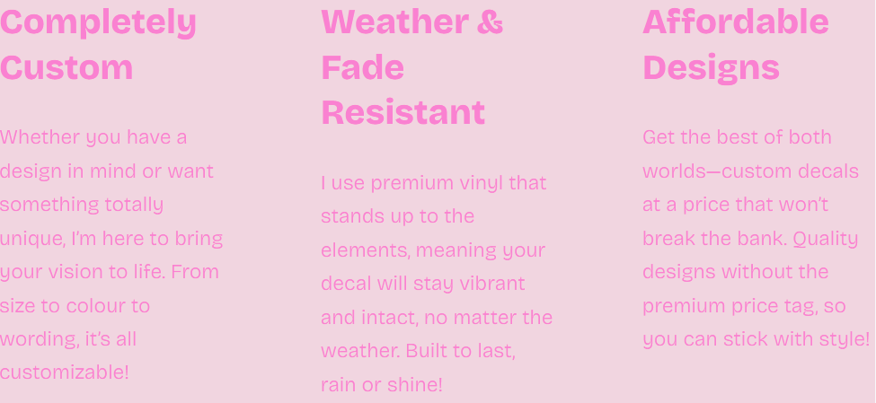 I started designing decals because I saw a gap in the market for better colour options, customization, and pricing. Whether you have a unique vision or just want to tweak an existing design, I’m here to bring your ideas to life with durable, custom decals!
